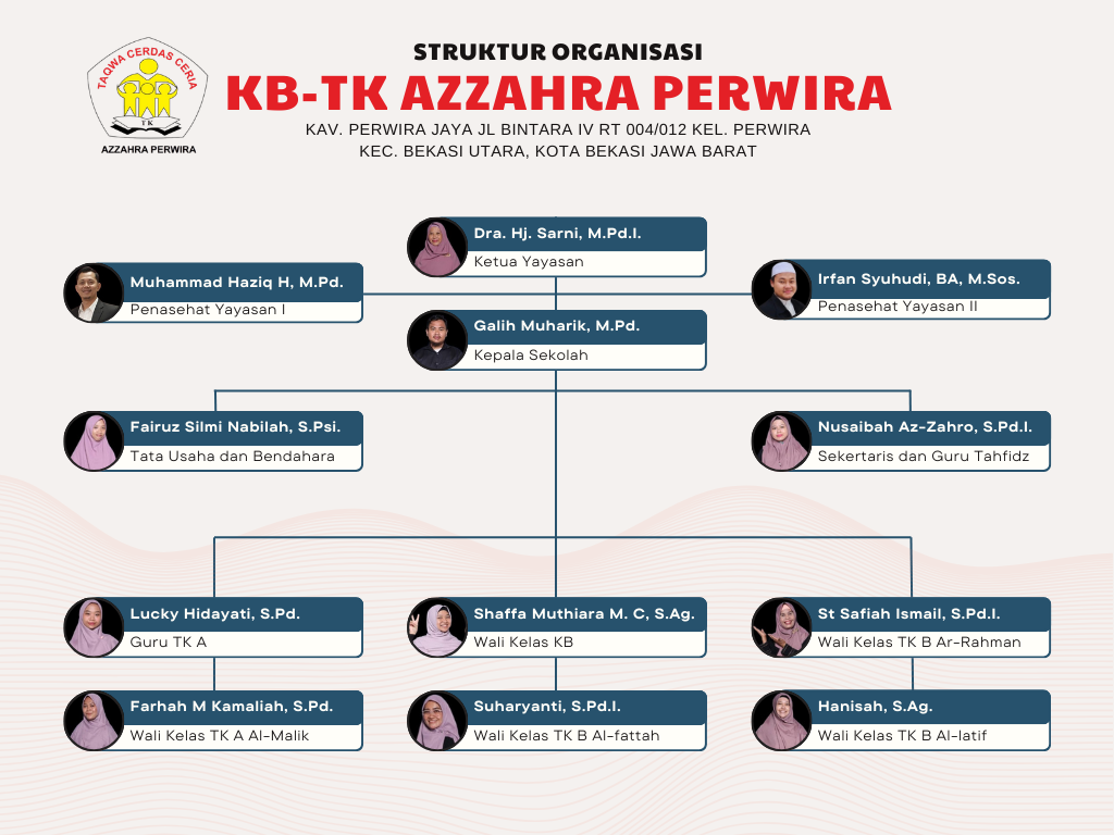 Cikal bakal berdirinya KB-TK AZ ZAHRA PERWIRA merujuk pada gambaran kondisi masyarakat sekitar serta melihat demografi warga khususnya di RW 012 Kelurahan Perwira Kecamatan Bekasi Utara yang mayoritas beragama Islam. Melihat kondisi tersebut, yayasan terinisiasi membentuk sebuah lembaga sebagai moda dalam mencetak generasi penerus pemimpin bangsa yang berakhlakul karimah. Kami terus berikhtiar membentuk generasi yang bertaqwa, cerdas dan terampil dengan bimbingan untuk menggapai kebahagian hidup di dunia & akhirat.